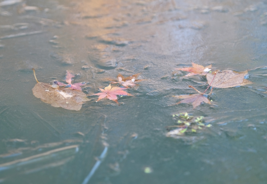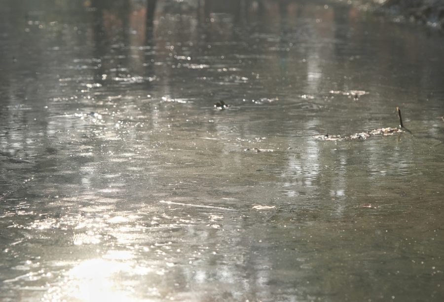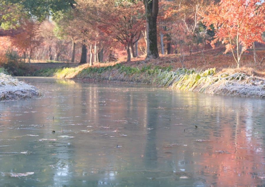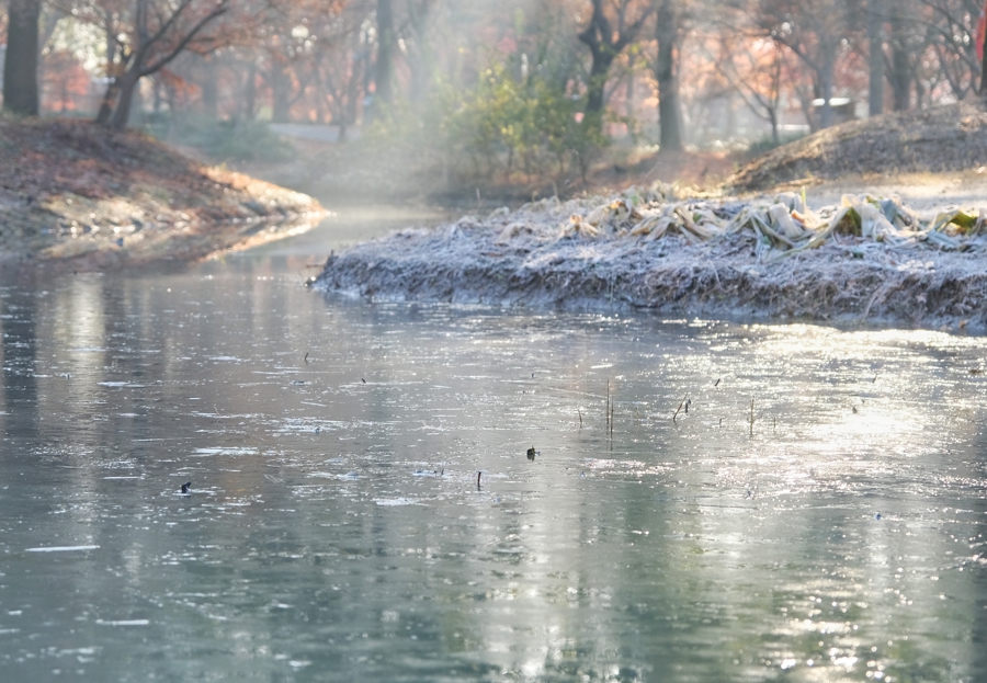 12月15日清晨,受辐射降温影响,申城寒气逼人,郊区最低-4℃,有冰冻。在金山区朱泾镇花开海上生态园,秋景园区域的小河道因低温结起了一层薄冰。