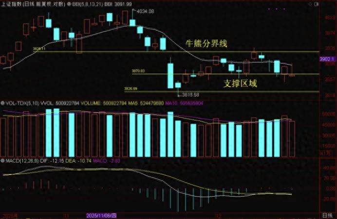 上证指数再次反弹摸了下3890点的压力,因为成交量不足,二次回踩探底。今天收盘价破位3870点,继续进入3870-3830点支撑区间融通资产,距离时间周期到位还有2个交易日,所以希望这里磨出一个低点,然后展开筑底行情。